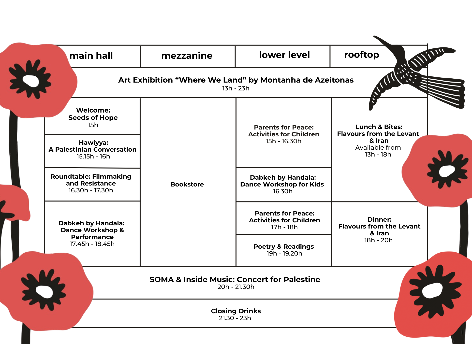 Ongoing Throughout the Day 13h to 23h: Art exhibition • Fair • Bookstore • Palestinian food
